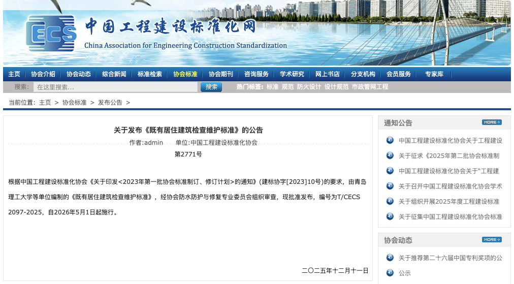 20251211日,中國工程建設標準化協會(CECS)正式批準發布了兩項關鍵行業標準——《既有公共建筑檢查維護標準》(T/CECS 2098-2025)與《既有居住建筑檢查維護標準》(T/CECS 2097-2025)。該兩項標準的制定是基于協會《2023年第二批協會標準制訂、修訂計劃》(建標協字〔202350號)的要求,由青島理工大學等單位牽頭編制,青島中邦科技新材料有限公司作為參編單位之一,為標準的制定貢獻了專業力量。